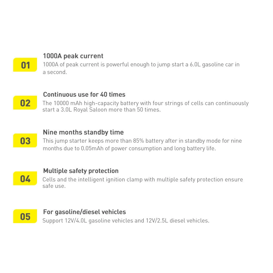 Benötigen Sie ein zuverlässiges Startgerät, das Sie unabhängig von Pannenhelfern macht und Ihnen ermöglicht, Ihr Auto auch bei Kälte selbstständig zu starten? Eine leere Batterie muss kein Problem sein, wenn Sie einen Baseus-Starter haben. Es handelt sich um ein Gerät mit hervorragenden Parametern, das sogar 1000 A Spitzenstrom erreicht. Stark genug, um das Auto im Notfall bis zu 50 Mal nach dem Aufladen zu starten! Ein effizienter, sicherer, praktischer und gleichzeitig intuitiv zu bedienender Starter sollte in keiner Garage fehlen!